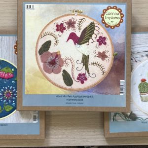 Each kit contains pre-printed fabric, stitch guide, bamboo hoop, floss and needle.