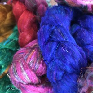 At The Lace Knittery HQ we have used it on it’s own to spin with, which it does like a dream on both drop spindles and spinning wheels. It blends beautifully with any other fibre and a little goes a long way, you only need about 10% to get the colour and effect. Our customers continually amaze us and love it as much as we do. They have used it to not only spin with but to (from the top!) wet felt, needle felt, knit with, crochet with, weave on a tablet loom, weave into knitting on a machine, make into bowls, couched in hand embroidery, used in machine embroidery and use in mixed media.