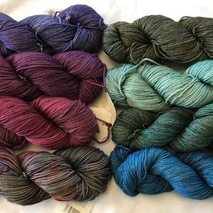 The Lace Knittery hand painted Boucle yarn is DK/sock weight.