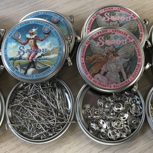 £8.65A beautiful range from Sajou of essential haberdashery in vintage inspired tins. Each tin opens and closes with a click/clack turning mechanism (remember them from shoe polish tins!) and as a vintage label to the front. I want them all.