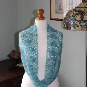 It can be any length and is a good stash buster. The yarn in the photo is a DK weight natural baby alpaca, silk and cashmere yarn available from The Lace Knittery.