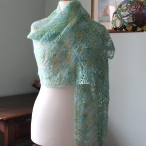 A complete knitting kit of one of The Lace Knittery’s most popular designs. It is a rectangular wrap with a central peacock feather motif. The kit contains yarn of your choice full instructions, a pattern with both written and charted instructions, a pair of custom made, beaded bamboo knitting needles and a roomy project bag. It is presented in a glossy card gift bag.
